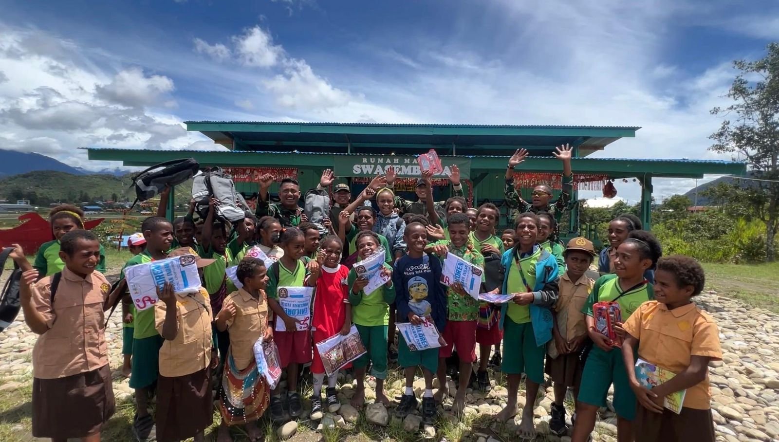 Satgas Yonif 751/VJS Gelar “Makan Bersama” di RM Swasembada: Diawali Kegiatan Baris Berbaris, Pembacaan Pancasila, dan Penghormatan Bendera, Anak-Anak Berprestasi Dapat Seragam Baru