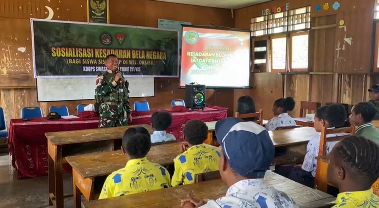 Pegunungan Bintang, Papua Pegunungan — Satgas Pamtas RI–PNG Yonif 751/Vira Jaya Sakti (VJS) melaksanakan kegiatan sosialisasi kepada siswa-siswi tingkat SMP di wilayah Pegunungan Bintang. Sosialisasi ini memuat materi Bela Negara sebagai upaya menanamkan jiwa nasionalisme, kedisiplinan, serta semangat persatuan kepada para remaja di daerah perbatasan. (Kamis,29/1/2026).