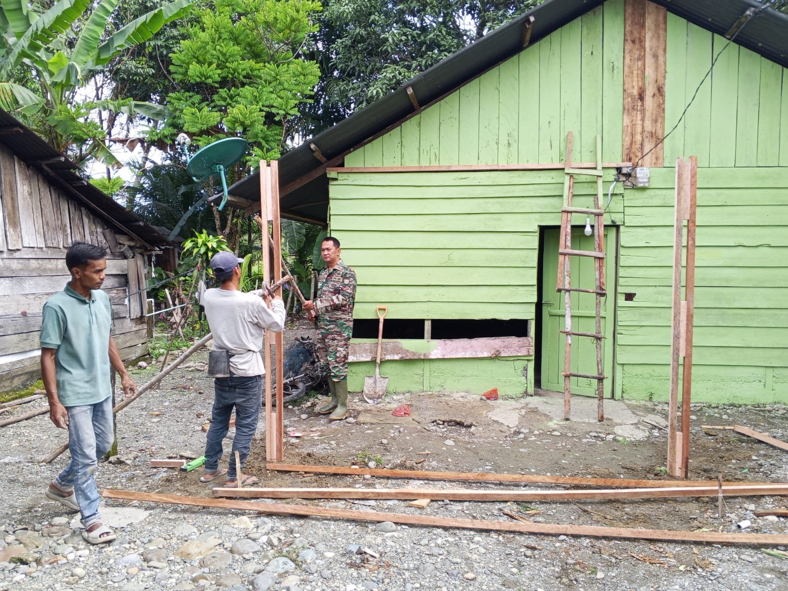 Warga menyaksikan bagaimana pengerjaan dilakukan dengan penuh kehati-hatian. Gotong royong menjadi jembatan kebersamaan. Tangan-tangan prajurit dan masyarakat menyatu, memahat kayu menjadi penopang kehidupan yang lebih layak.