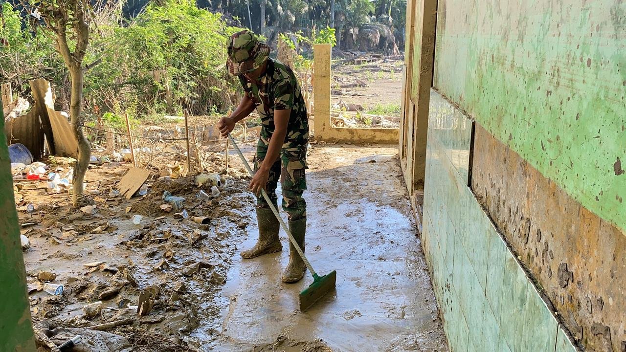 Prajurit Macan Leuser kembali melaksanakan kegiatan pembersihan di Sekolah Dasar Negeri (SDN) 06 Kuala Simpang sebagai bentuk kepedulian nyata terhadap dunia pendidikan yang terdampak banjir.