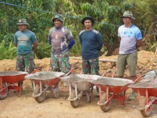 Personel Satgas bersama masyarakat bahu-membahu menyelesaikan setiap tahapan pekerjaan. Warga secara sukarela membantu proses pembangunan sebagai bentuk partisipasi dalam pembangunan desa.