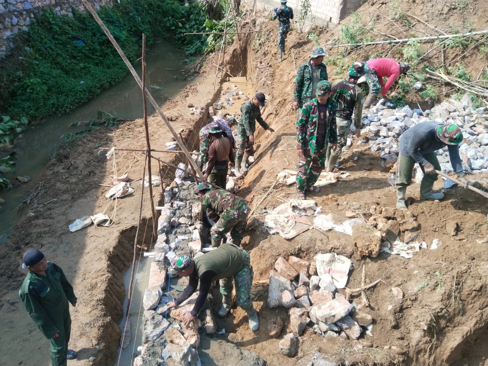 Sejak pagi hari, personel Satgas bersama masyarakat bahu-membahu melaksanakan berbagai tahapan pekerjaan konstruksi, mulai dari penataan material hingga proses penguatan struktur jembatan.
