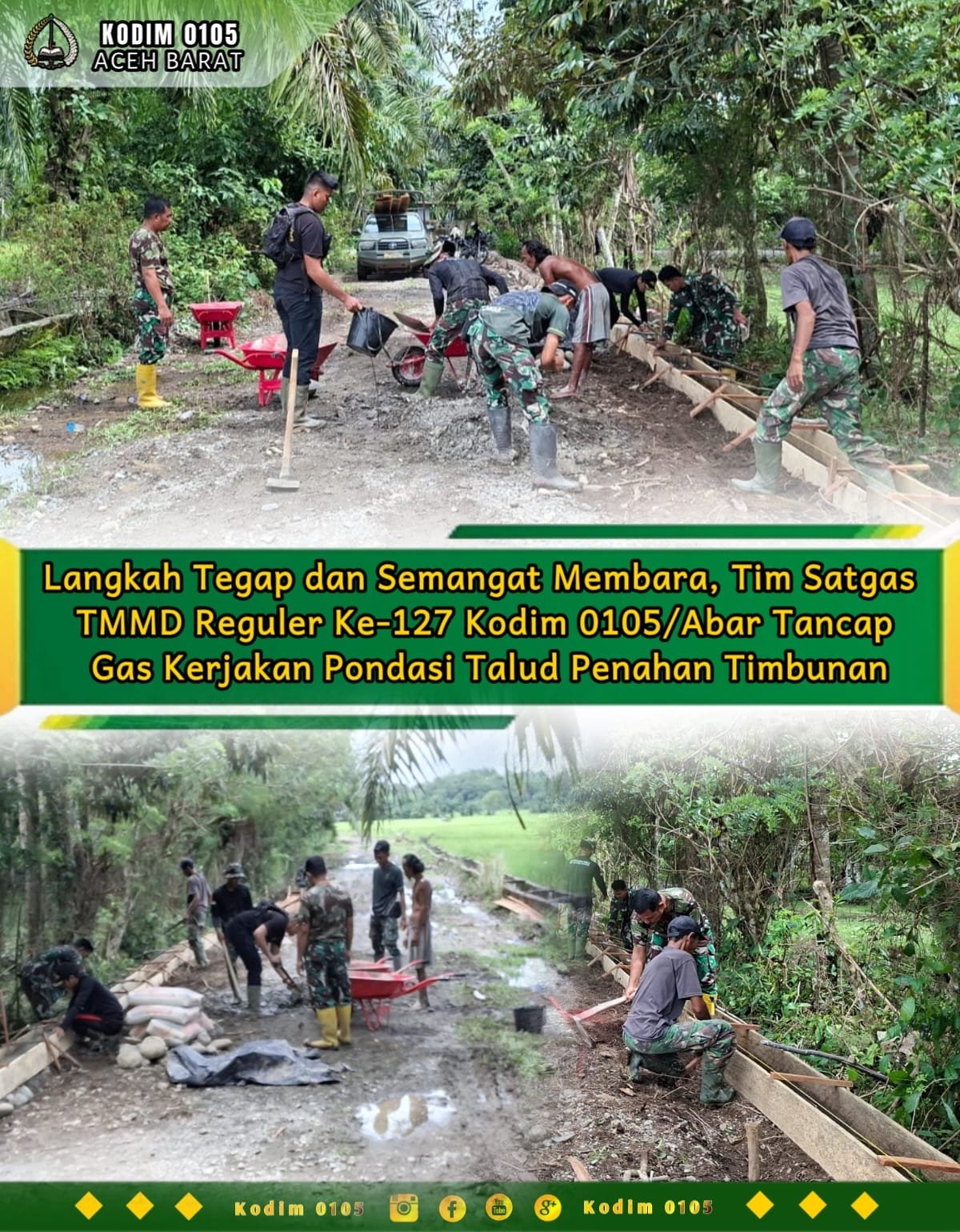 Aceh Barat — Semangat kebersamaan antara prajurit TNI dan masyarakat tampak kuat dalam pelaksanaan program TNI Manunggal Membangun Desa (TMMD) Reguler ke-127 yang dilaksanakan Kodim 0105/Abar di Desa Pasi Aceh, Kecamatan Woyla, Kabupaten Aceh Barat.