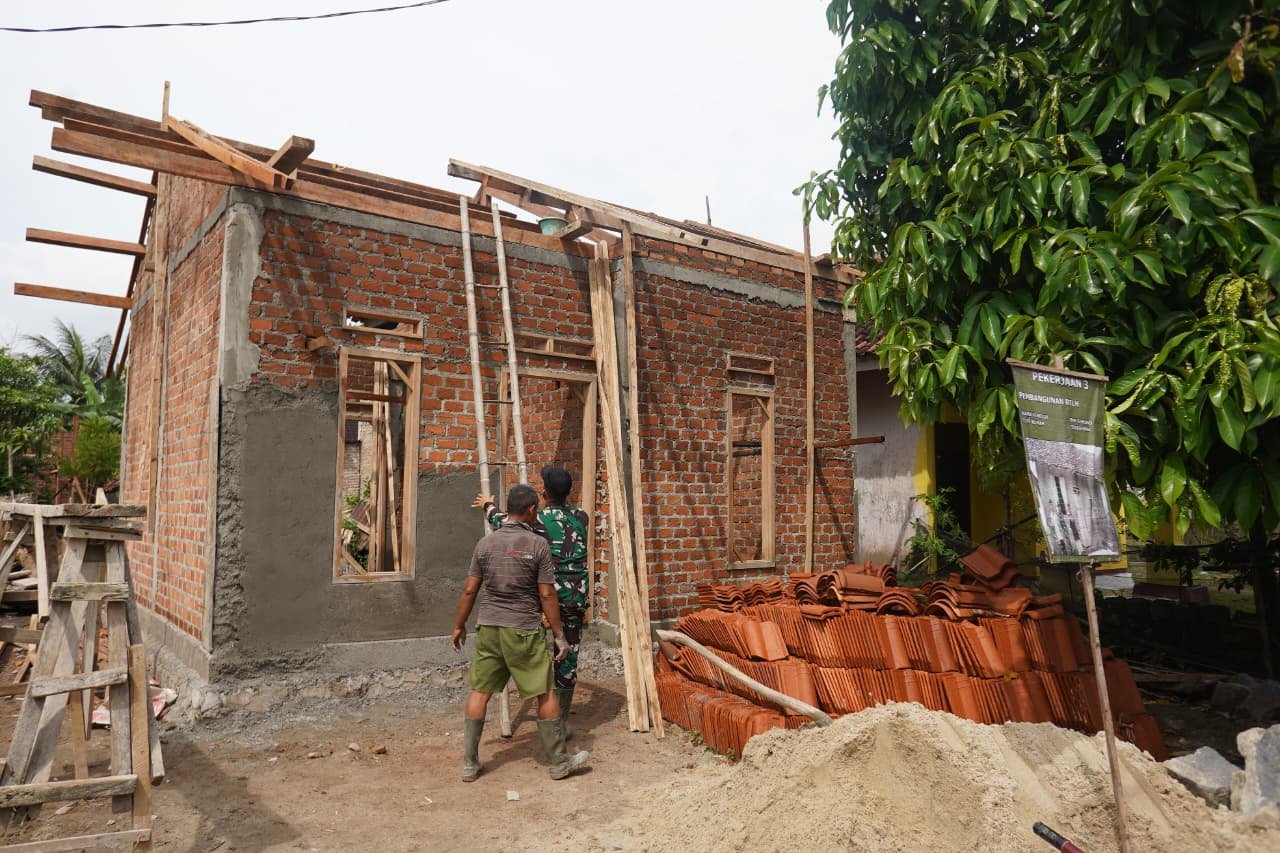 Di bawah terik matahari, personel Satgas TMMD bersama warga bergotong royong memasang rangka atap dengan penuh ketelitian. Kuda-kuda yang terpasang bukan sekadar struktur bangunan, tetapi simbol perlindungan dan masa depan yang lebih baik bagi keluarga penerima manfaat. Sementara itu, plesterisasi dinding depan dilakukan untuk memperkuat konstruksi sekaligus memperindah tampilan rumah.