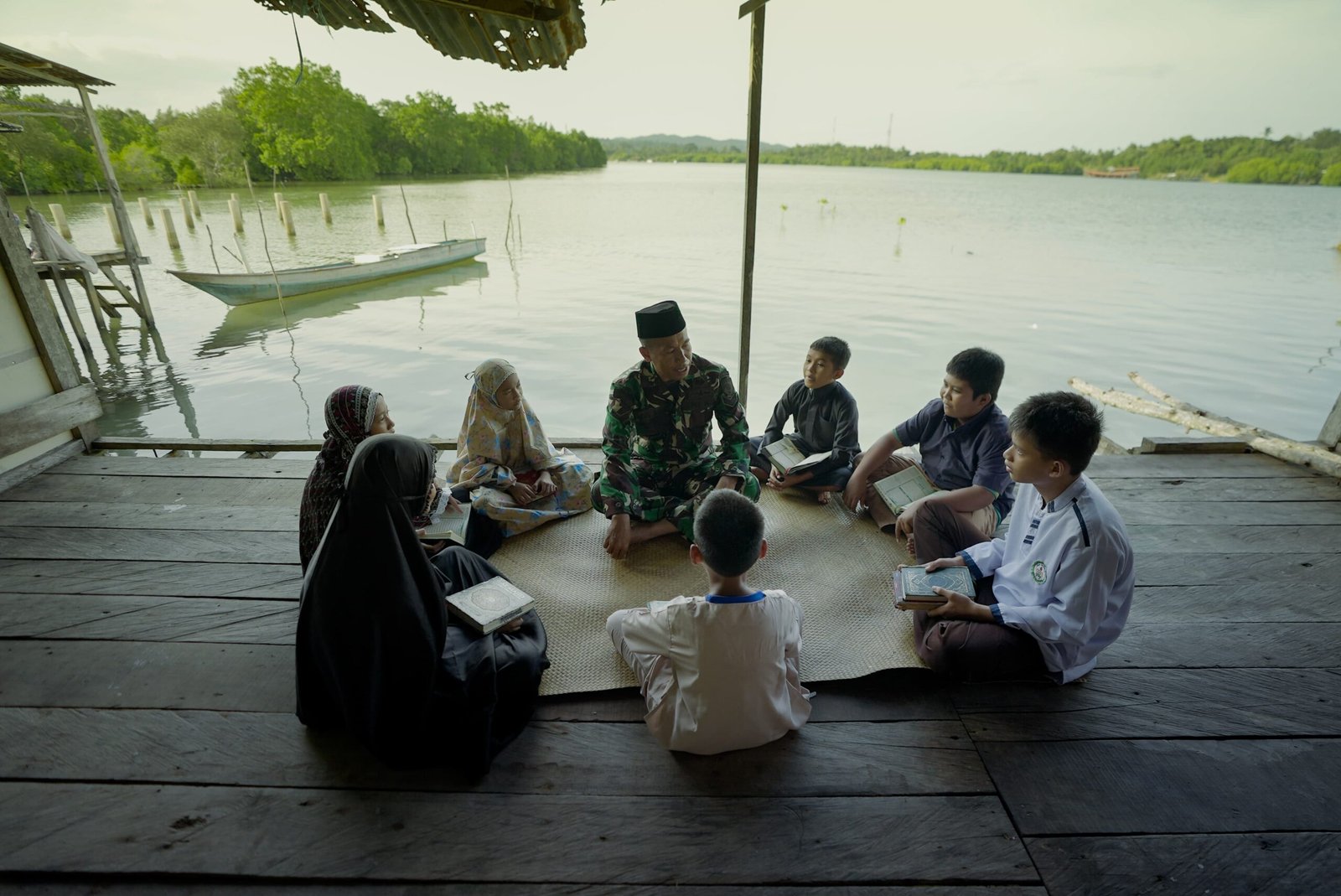 Di tengah kesibukan membangun infrastruktur, prajurit TNI meluangkan waktu untuk mengajarkan bacaan Al-Qur’an kepada anak-anak setempat. Kegiatan ini menjadi bagian dari upaya membentuk karakter dan moral generasi muda.