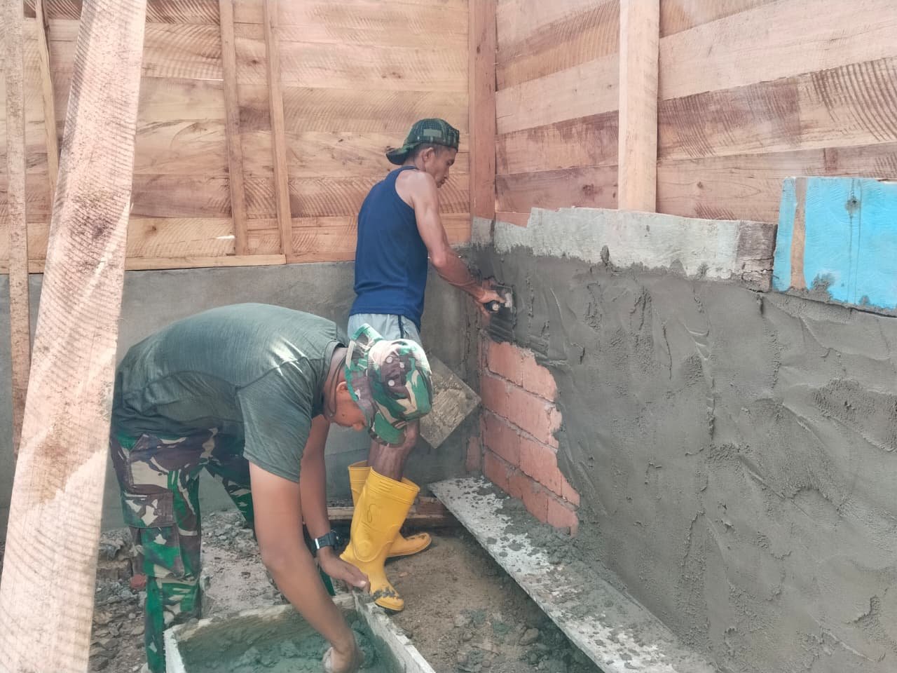 Dengan gerakan terampil memainkan sendok semen, personel Satgas memastikan setiap sisi dinding tertutup rata dan kuat. Tahap ini menjadi kunci dalam meningkatkan kualitas struktur bangunan secara menyeluruh.