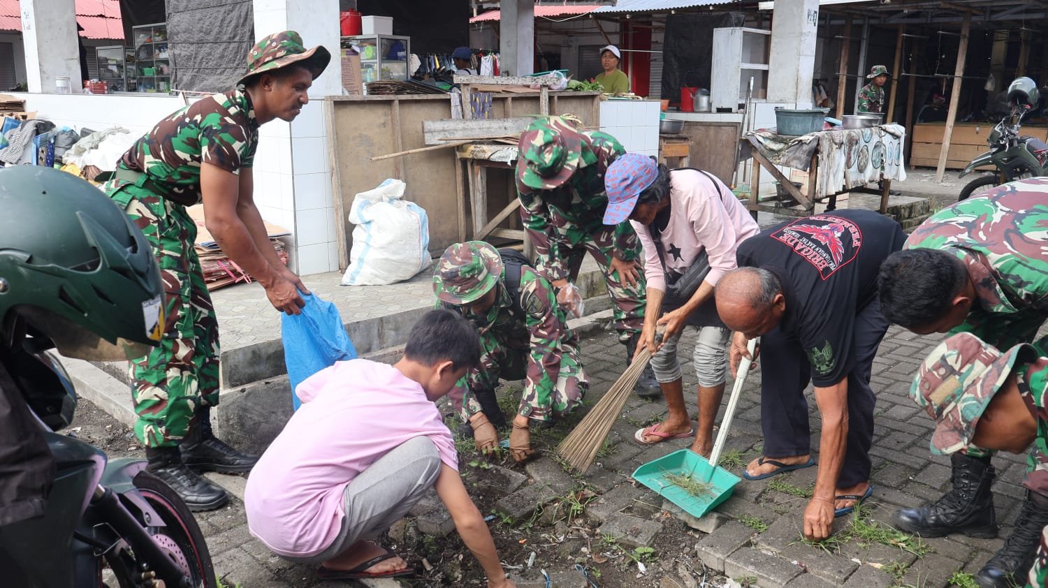 Di wilayah Amurang, Kabupaten Minahasa Selatan, karya bakti digelar di Pasar 54 Amurang, Kelurahan Uwuran I, dengan diikuti sekitar 30 orang. Kegiatan dipimpin Danramil 1302-14/Amurang Lettu Inf Jantje Marten Wulur bersama para Danramil jajaran Minahasa Selatan, unsur pemerintah kecamatan, serta perangkat kelurahan. Kegiatan diawali apel dan doa, kemudian dilanjutkan pembersihan area pasar hingga selesai dalam suasana penuh kebersamaan.