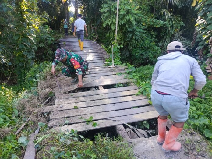 “Jembatan rapuh dimakan usia sangat mengancam keselamatan masyarakat yang melintas,” jelas Koptu Sudiman di sela-sela aktivitas gotong royong pembangunan. “