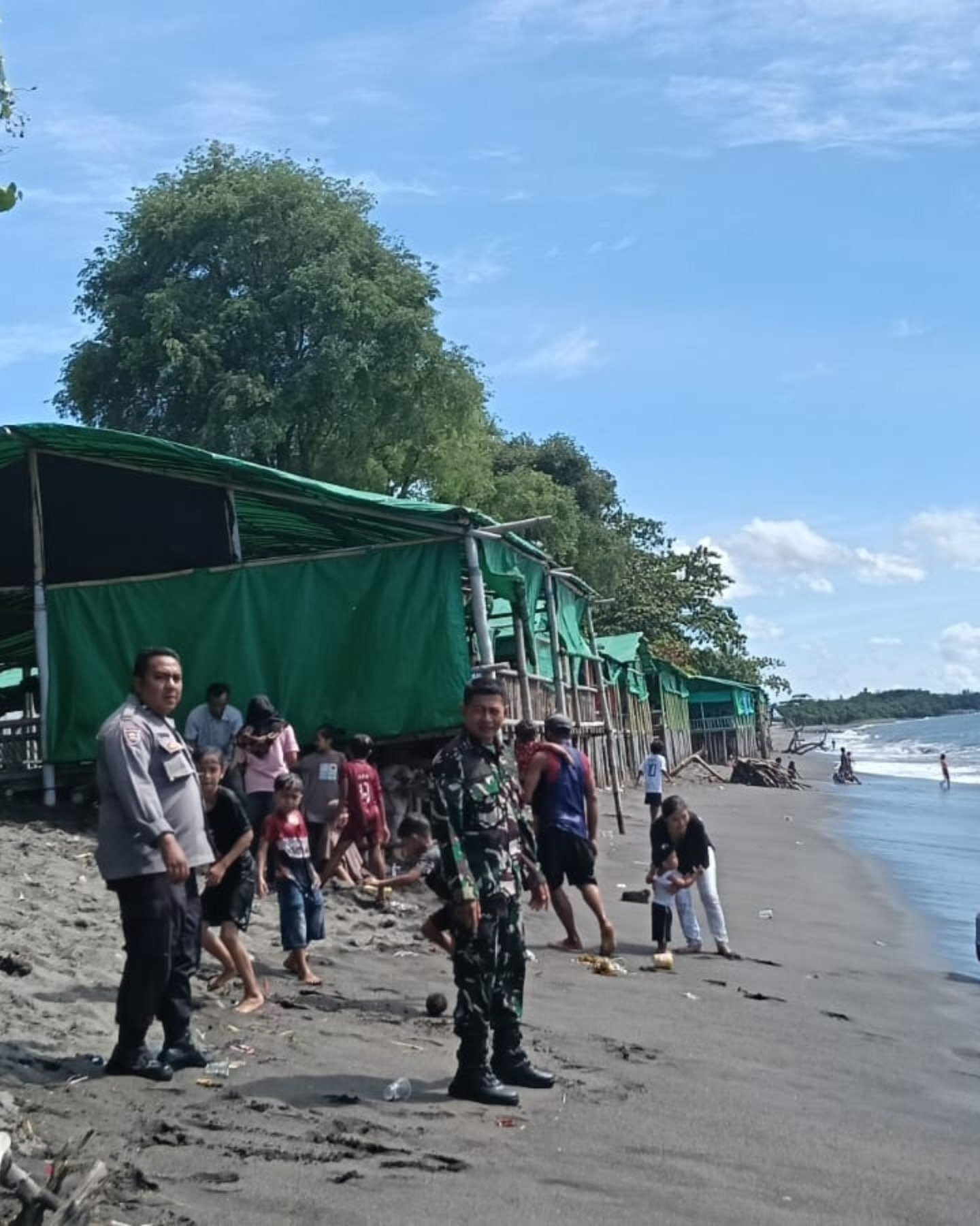 Babinsa Jempong Baru, Serka Samsuri, menjelaskan bahwa pengawasan dilakukan secara aktif dan humanis. Tidak hanya memantau situasi, petugas juga turun langsung berinteraksi dengan wisatawan. “Kami tidak sekadar memantau, tetapi juga memberikan imbauan agar wisatawan selalu berhati-hati, khususnya saat berenang, serta memperhatikan kondisi cuaca dan gelombang laut,” ujarnya.
