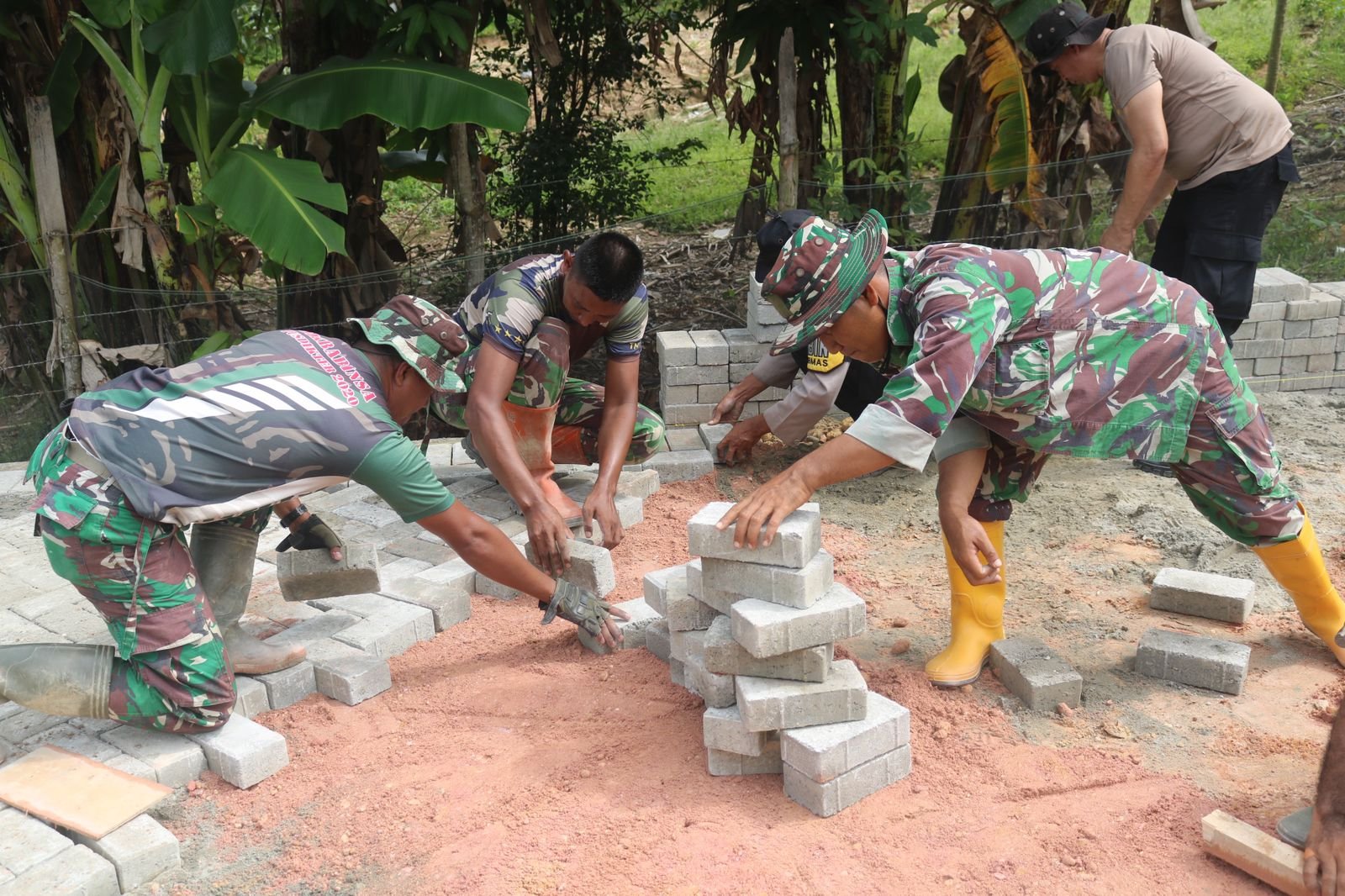 Kebersamaan tersebut tampak saat personel kedua institusi bahu-membahu memasang paving blok demi menciptakan akses jalan yang lebih layak bagi masyarakat.