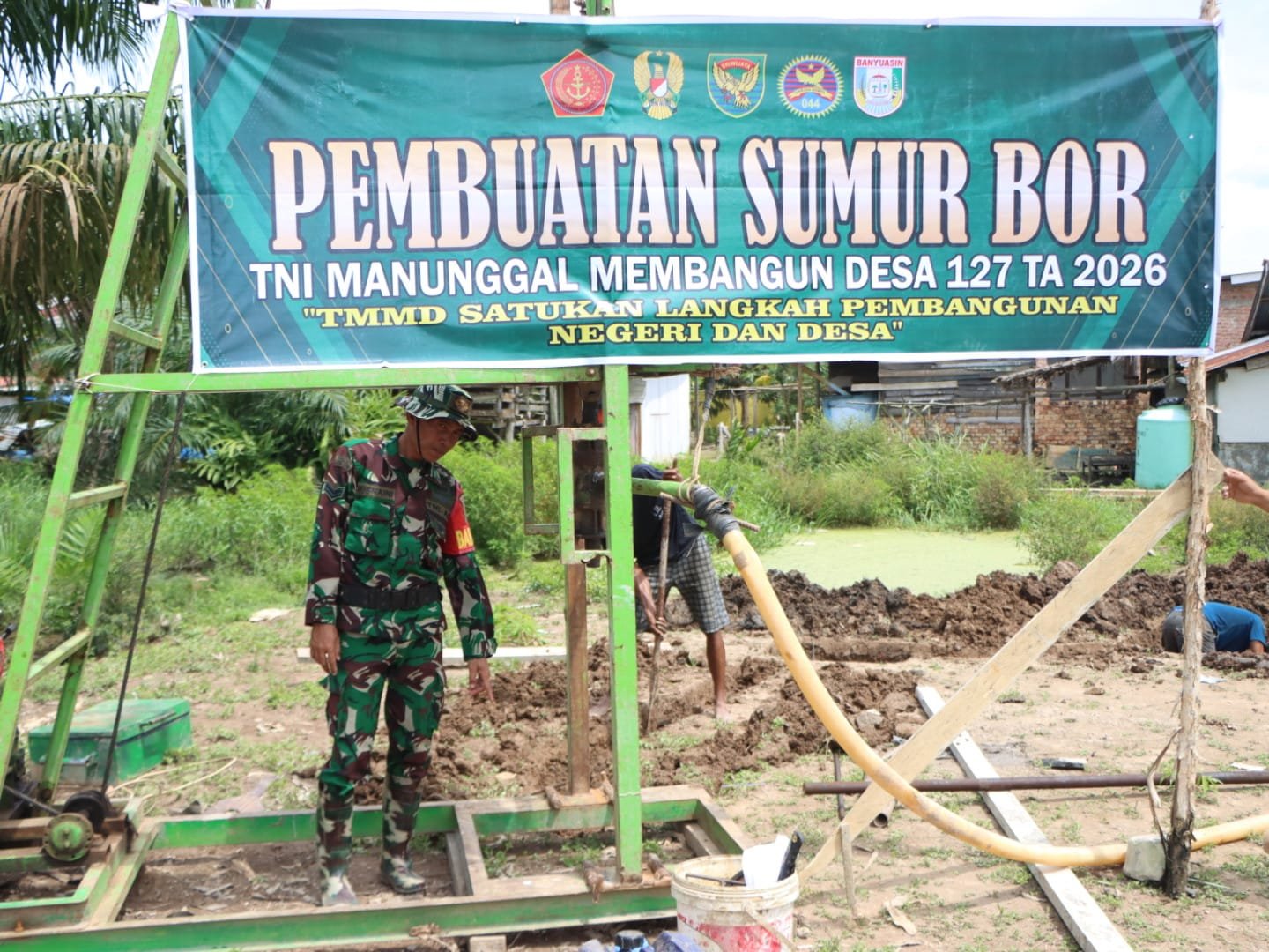 Banyuasin – Harapan masyarakat Desa Wonosari, Kecamatan Pulau Rimau, Kabupaten Banyuasin untuk mendapatkan akses air bersih mulai terwujud melalui program TMMD ke-127 yang dilaksanakan oleh Kodim 0430/BA. Peralatan sumur bor yang telah disiapkan kini dalam kondisi siap operasi.
