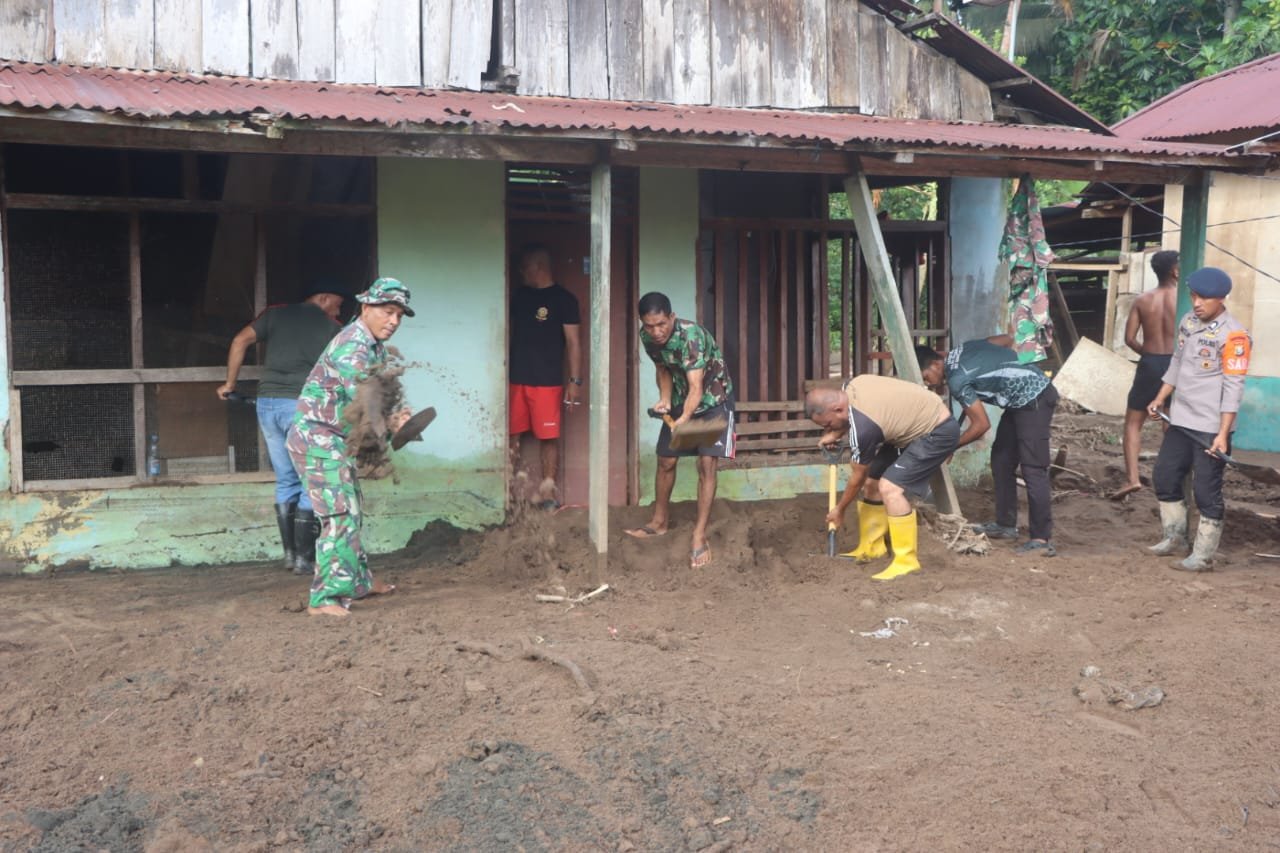 Halmahera Utara — Personel Kodim 1508/Tobelo bersama Tim Penanganan Bencana banjir dan longsor terus menunjukkan dedikasi dan kepedulian tinggi terhadap masyarakat terdampak. Dengan penuh semangat dan tanpa mengenal lelah, mereka melaksanakan pembersihan material sisa banjir di sejumlah titik yang terdampak.