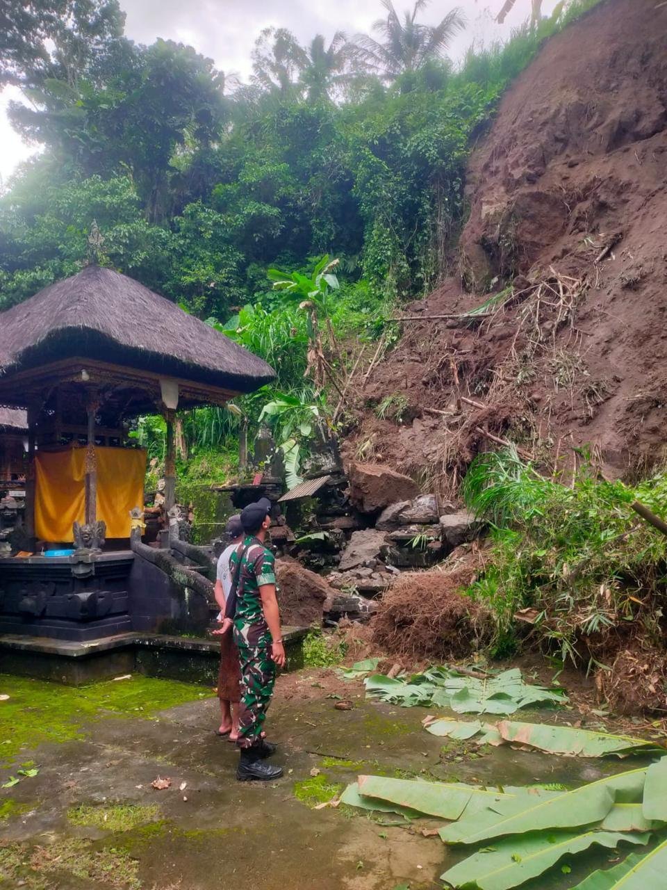 Klungkung,- Intensitas hujan tinggi yang mengguyur Klungkung diduga menjadi penyebab terjadinya musibah tanah longsor di Pura Manik Tirta Banjar Kawan, Desa Timuhun, Kecamatan Banjarangkan, Kabupaten Klungkung yang mengakibatkan beberapa pelinggih tertimbun material longsor pada Senin ( 19/01/26 ) pagi.