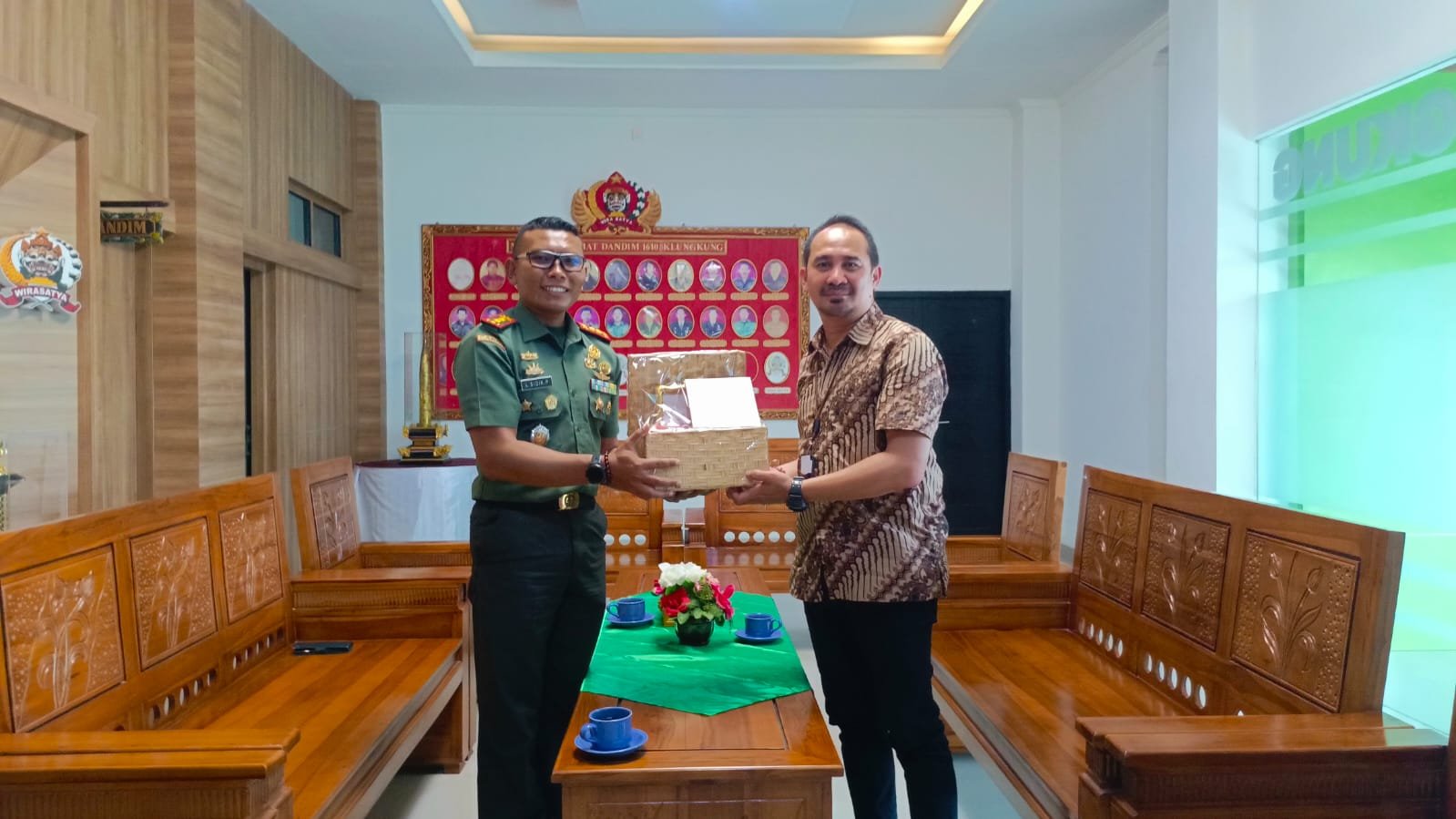 Tiba di Makodim, Kepala Cabang Bank Mandiri Klungkung Putu Angga Wiguna disambut langsung oleh Dandim 1610/Klungkung Letkol Kav Sidik Pramono, S. Sos., M.M., M.Han di lobi Makodim.