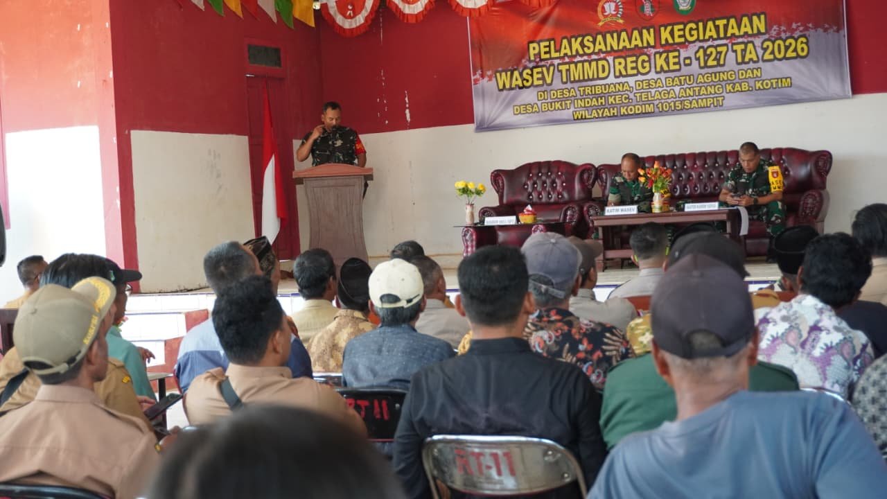 Kotawaringin Timur – Ketua Tim Wasev Mabes AD, Totok Sulistiyono, menyampaikan apresiasi terhadap progres pelaksanaan TMMD ke-127 Kodim 1015/Sampit saat kunjungan kerja di Desa Tri Buana, Selasa (03/03/2026).