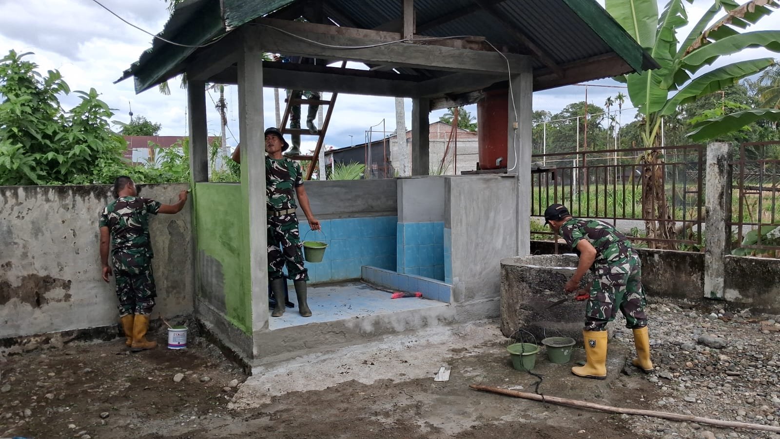 Di Desa Ujong Blang, Kecamatan Beutong, personel Satgas TMMD melaksanakan pengecatan dan pembersihan area penampungan air. Langkah ini dilakukan untuk menjaga kualitas bangunan sekaligus memastikan sarana air bersih dapat digunakan secara optimal oleh masyarakat.