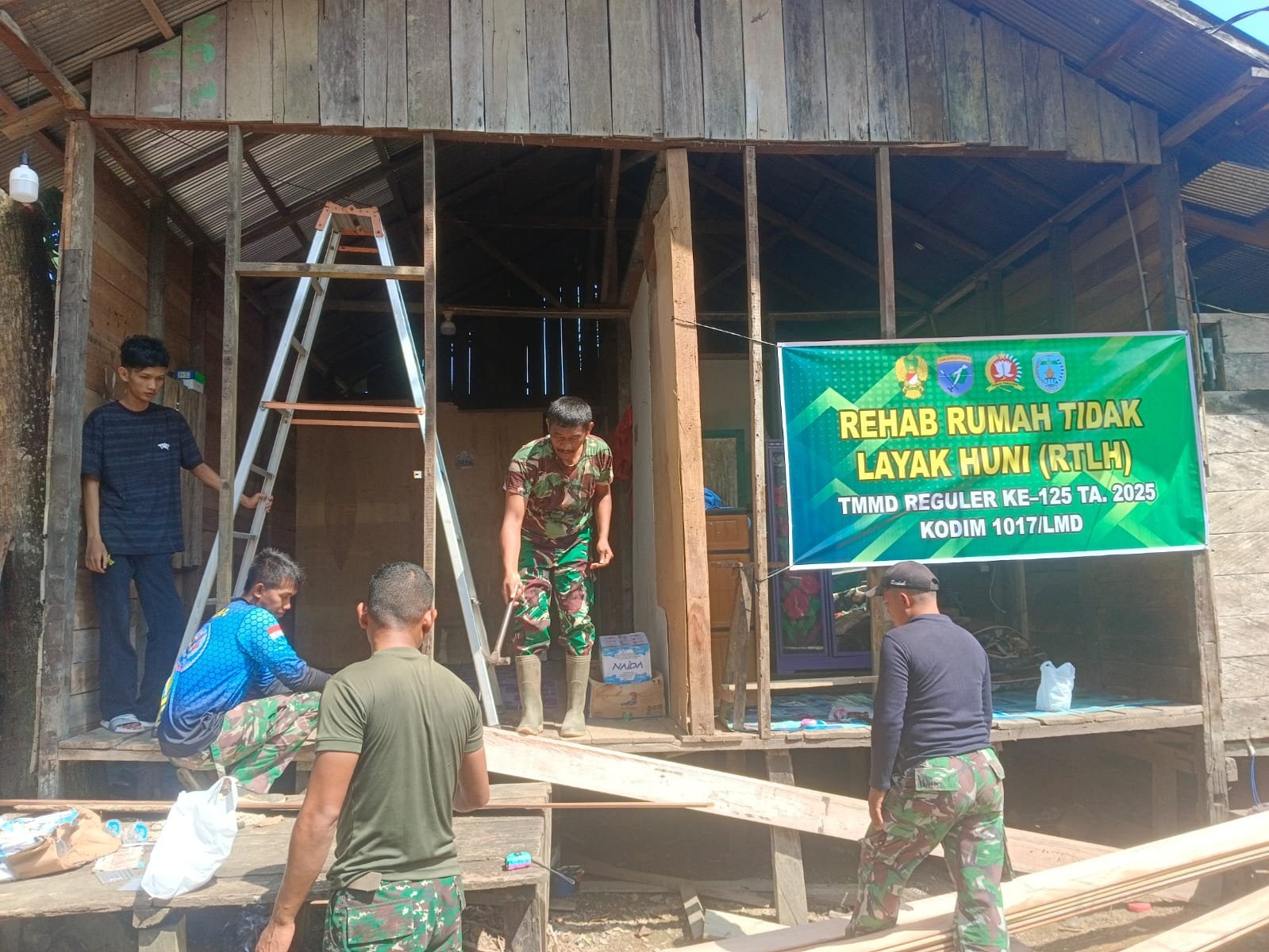 Bersama warga setempat, Satgas TMMD bahu membahu mengejar target pengerjaan rehab rumah ini agar cepat selesai dan bisa dimanfaatkan pemiliknya.