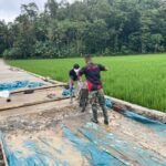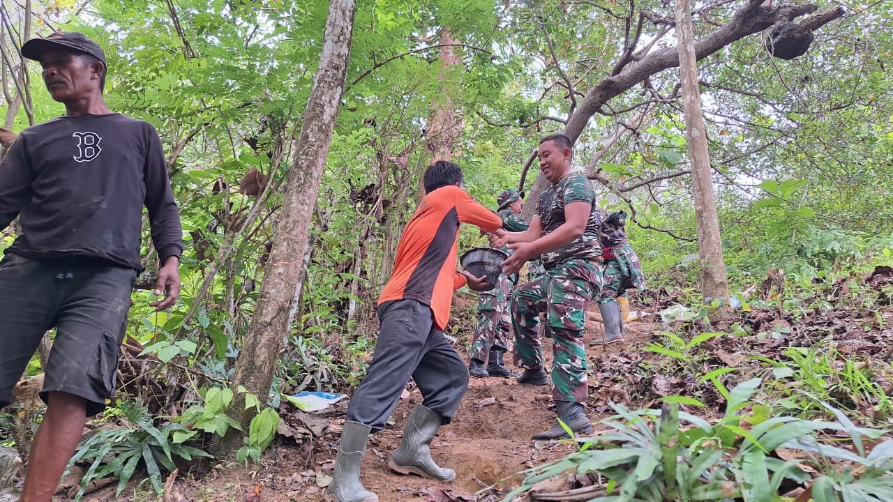 Meski berpuasa, semangat gotong royong tetap membara. Personel TNI dan warga saling mendukung demi tercapainya target sasaran fisik tepat waktu.