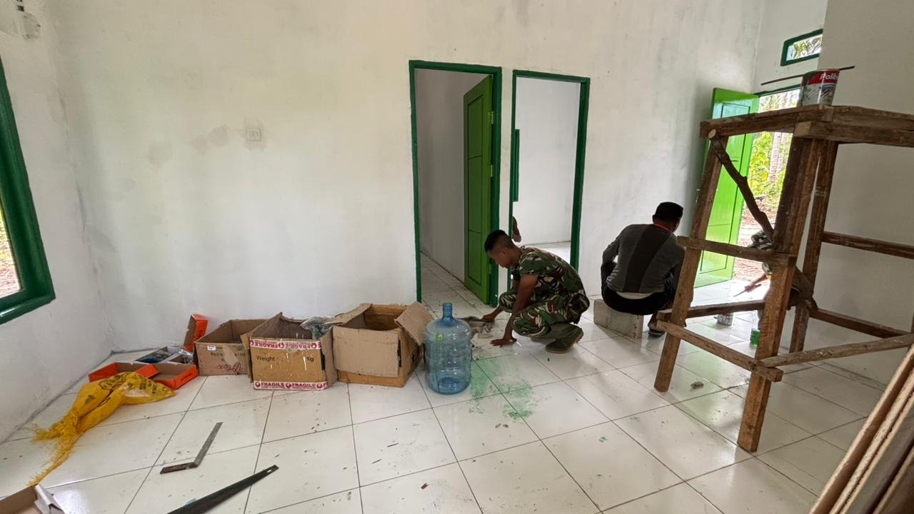 Rumah tersebut diperuntukkan bagi Ibu Evelina Surawi sebagai penerima manfaat program TMMD. Tahap finishing dilakukan untuk merapikan bagian dalam dan luar bangunan sebelum memasuki penyelesaian akhir.
