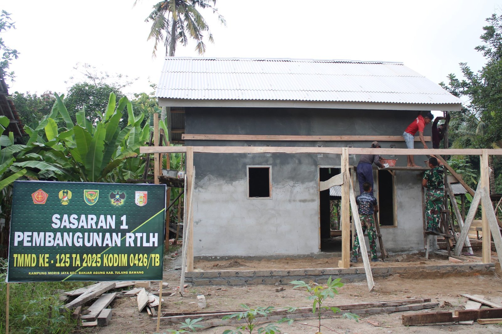 Tulang Bawang — Kegiatan TNI Manunggal Membangun Desa (TMMD) ke-125 Kodim 0426/Tulang Bawang terus menunjukkan progres nyata di berbagai titik lokasi. Salah satunya terlihat di sasaran 2 pembangunan Rumah Tidak Layak Huni (RTLH) yang berlokasi di Kampung Moris Jaya, Kecamatan Banjar Agung. Pada Minggu (03/08/2025), tim Satgas TMMD bersama warga mulai melakukan persiapan kayu sebagai material utama untuk kerangka atap rumah.