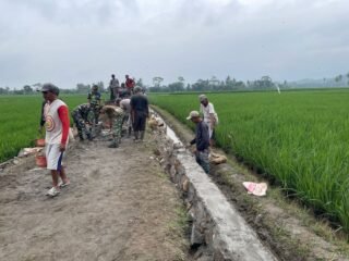 Pengerjaan rabat beton dilakukan secara bertahap dengan melibatkan personel TNI bersama masyarakat setempat. Sementara itu, pembangunan talud dikerjakan untuk memperkokoh badan jalan dan saluran, sehingga infrastruktur desa lebih aman dan tahan lama.