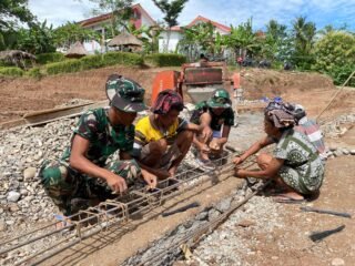 Pesawaran — Satgas TNI Manunggal Membangun Desa bersama Kodim 0421/Lampung Selatan terus melanjutkan pekerjaan rabat beton di Desa Tanjung Rejo, Kecamatan Way Khilau, Kabupaten Pesawaran.