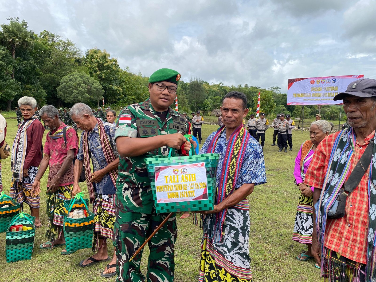 NTT–Kefamenanu. Kepedulian terhadap masyarakat kembali ditunjukkan dalam rangkaian kegiatan Upacara Penutupan TMMD Ke-127 Kodim 1618/TTU yang digelar di Desa Sunkaen, Kecamatan Bikomi Nilulat, Kabupaten Timor Tengah Utara (TTU), Rabu (11/03/2026) Dalam kesempatan tersebut, Danrem 161/Wira Sakti Brigjen TNI Hendro Cahyono bersama Ketua Persit KCK Koorcab Rem 161 PD IX/Udayana Ny. Kartika Adiningtyas Cahyono melaksanakan kegiatan pembagian bantuan sembako kepada masyarakat Desa Sunkaen.