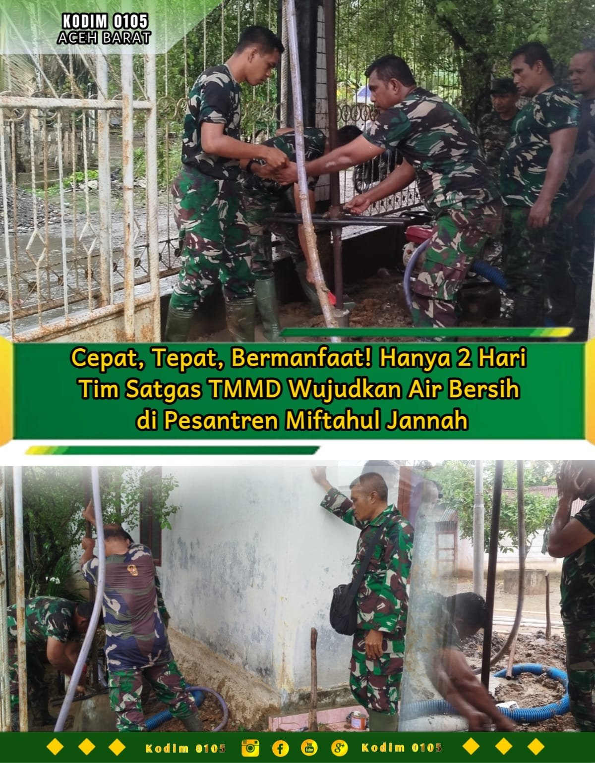 ACEH BARAT – Komitmen TNI AD dalam membantu masyarakat kembali diwujudkan melalui program TMMD Reguler ke-127 Kodim 0105/Abar. Dalam waktu dua hari, sumur bor berhasil dibangun di Pesantren Miftahul Jannah, Desa Lueng Jawa, Kecamatan Woyla.