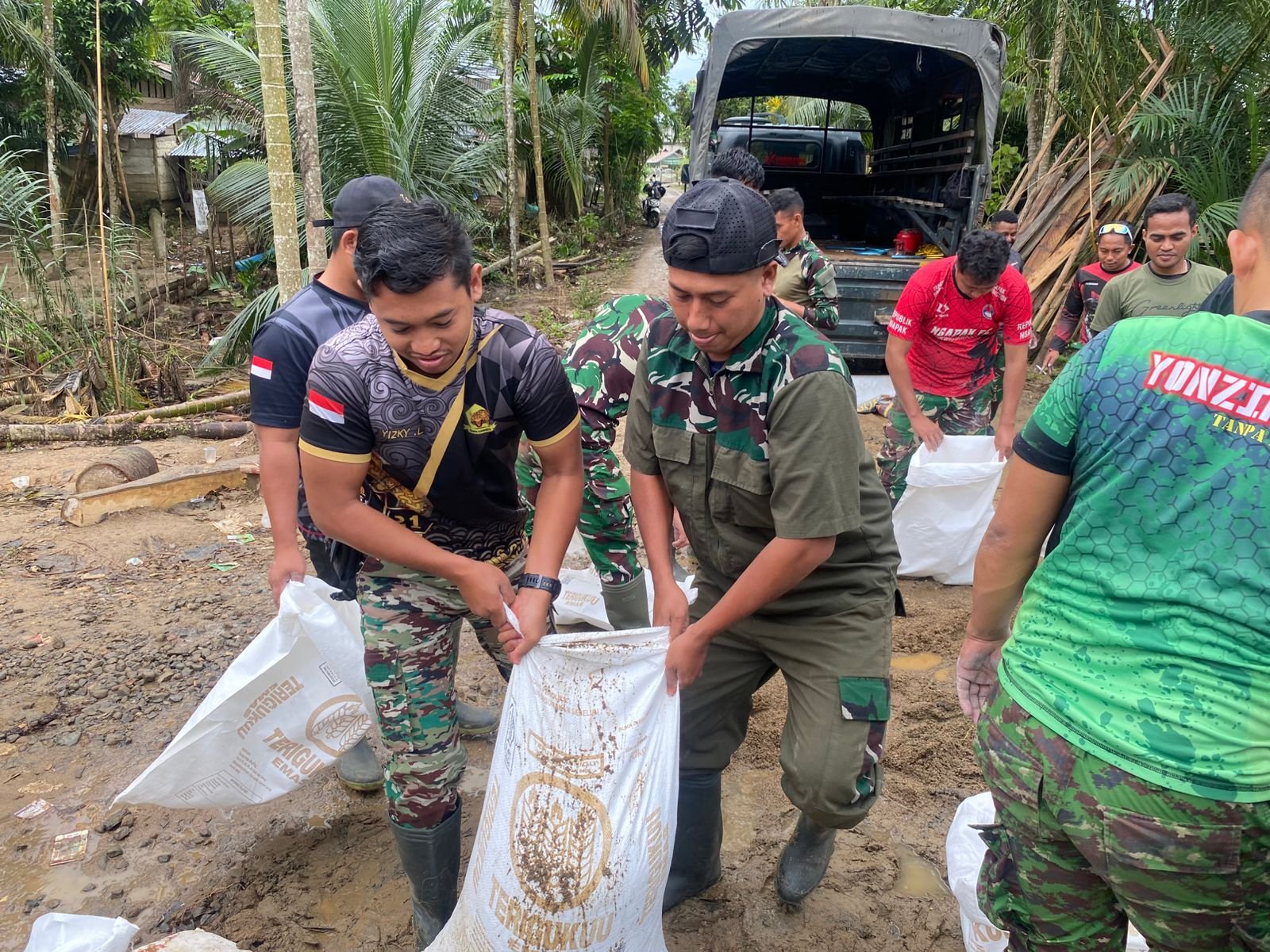 Di lokasi pengerjaan, personel TNI tampak bahu-membahu mengisi tanah ke dalam goni dan memperkuat pangkal jembatan sebagai bagian dari konstruksi darurat.
