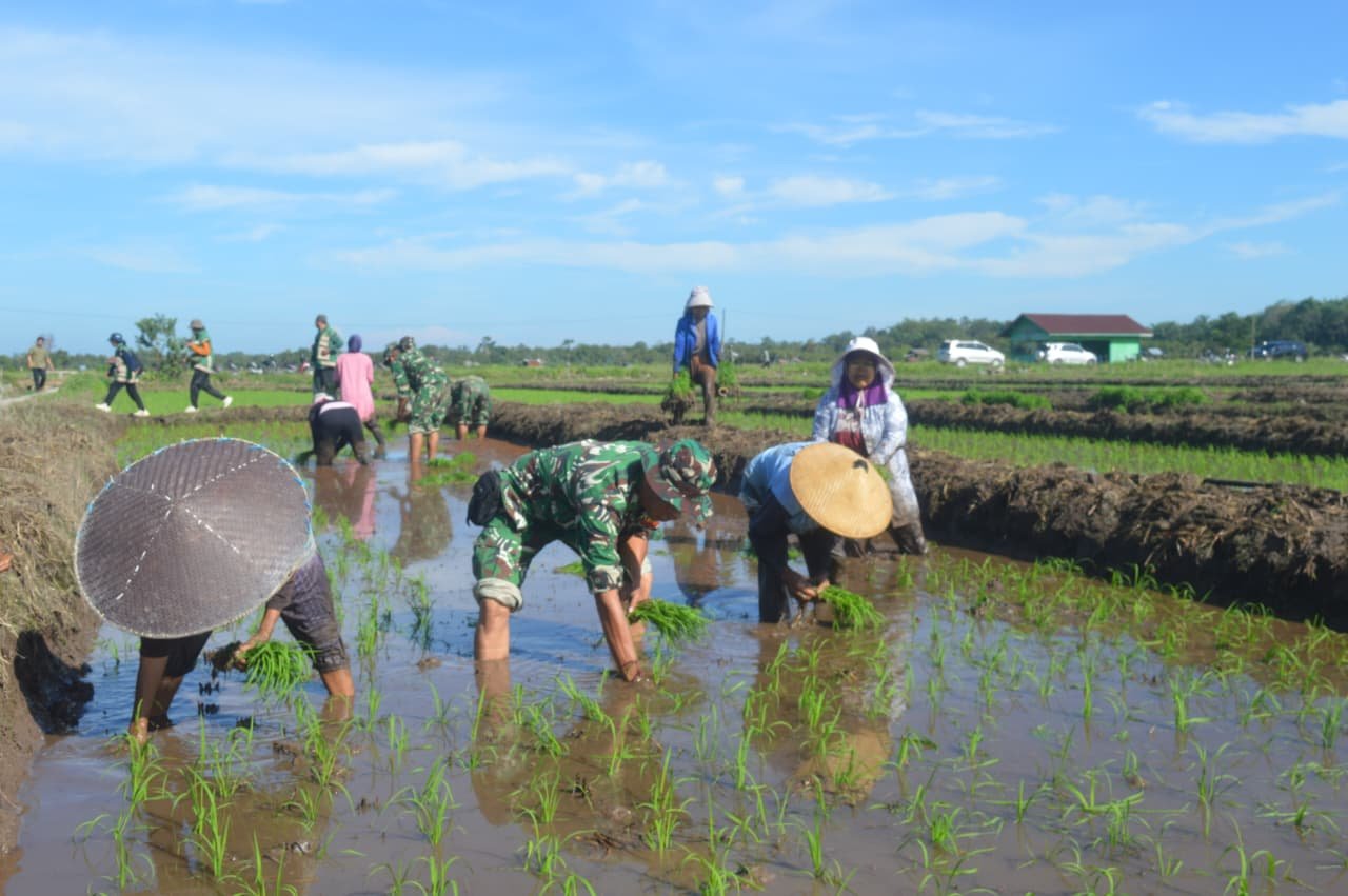 Kotawaringin Barat – Program TNI Manunggal Membangun Desa (TMMD) Reguler Ke-128 Kodim 1014/Pangkalanbun terus menunjukkan komitmennya dengan fokus pada penguatan ketahanan pangan melalui kegiatan di sektor pertanian. Hal ini terlihat dalam kegiatan penanaman padi bersama di lahan persawahan Desa Berambai Makmur, Kecamatan Pangkalan Banteng, Kabupaten Kotawaringin Barat, Kamis (23/4/2026).