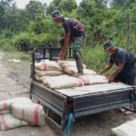 Personel TNI bersama warga bahu-membahu mengangkut puluhan sak semen secara manual menuju titik pengecoran sepanjang ratusan meter. Dengan semangat gotong royong, mereka saling membantu, mulai dari memanggul, menggunakan gerobak, hingga sepeda motor.