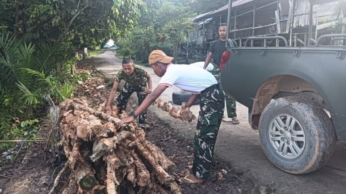 Pasi Ter Kodim 1014/Pbn, Kapten Czi M. Yunus, menegaskan bahwa tahap penyiapan kayu ini sangat penting sebagai fondasi awal pembangunan jembatan.