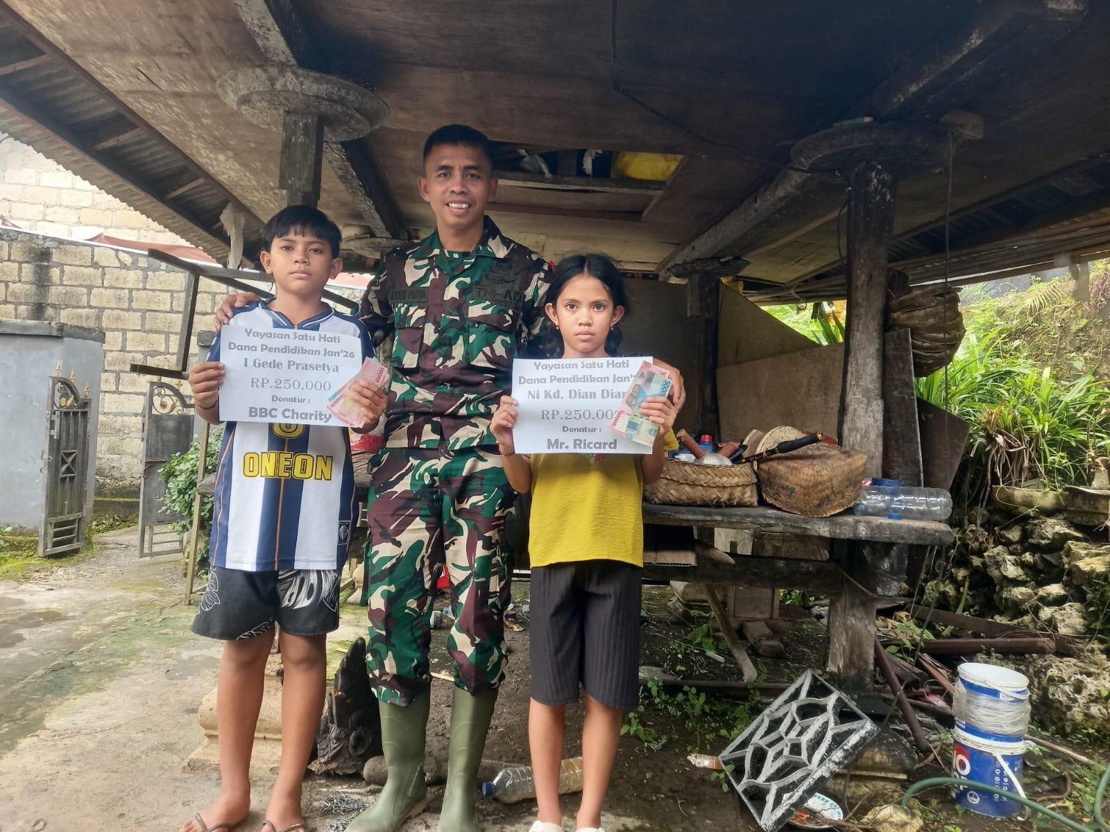 Klungkung,- Bintara Pembina Desa ( Babinsa ) Klumpu Koramil 1610-04/Nusa Penida Kopka Kadek Parta kembali menyalurkan dana bantuan pendidikan rutin dari Yayasan Satu Hati Bali kepada 2 orang anak asuhnya yang ada di Banjar Tiagan, Dusun Rata, Desa Klumpu, Kecamatan Nusa Penida, Kabupaten Klungkung pada Sabtu ( 24/01/26 ).