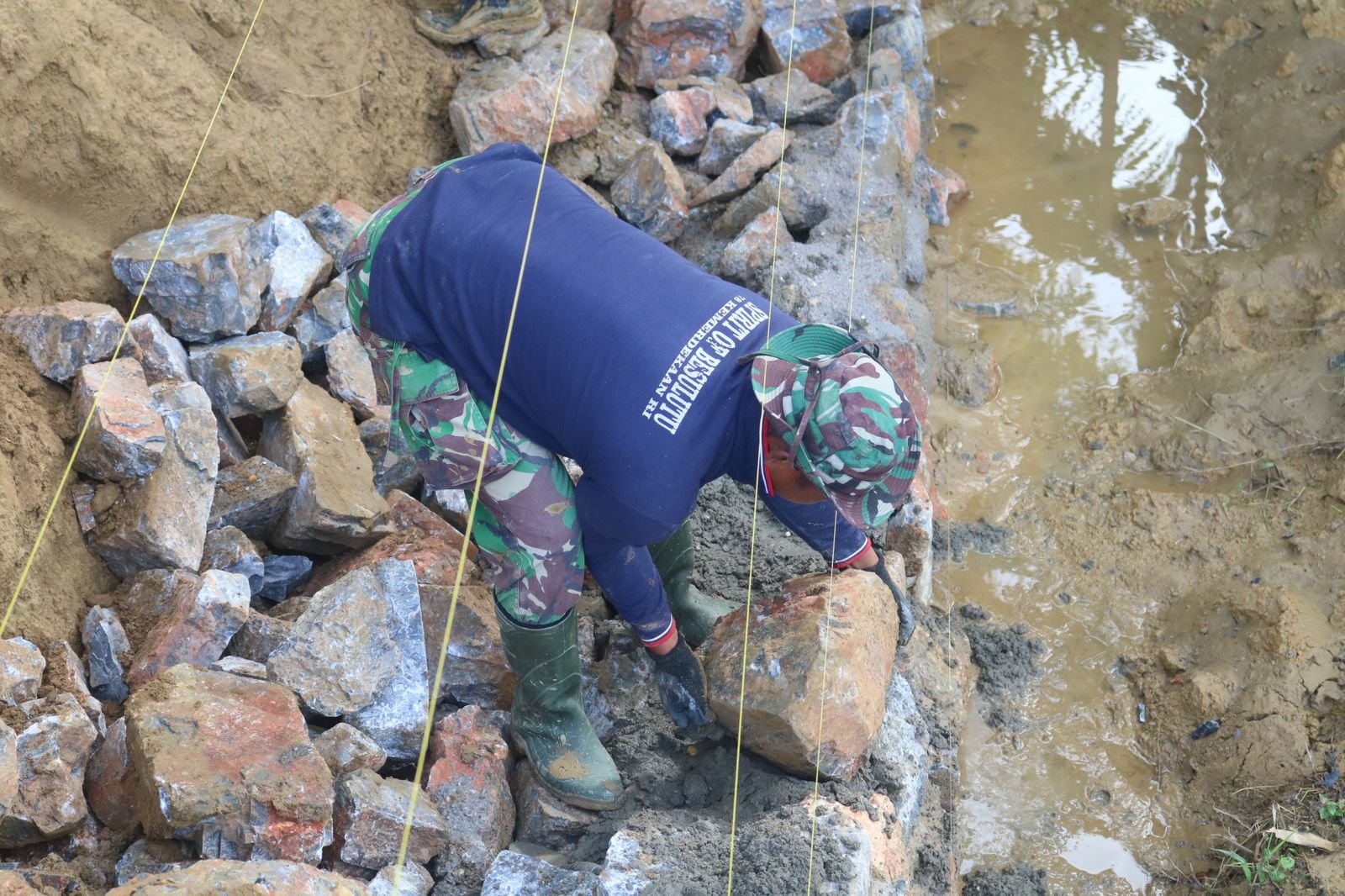 Kendari – Kondisi medan yang licin dan berlumpur tidak menyurutkan langkah Satgas TMMD 127 dalam melangsir material pembangunan talud jembatan di Kelurahan Anggoeya, Kamis (19/2).