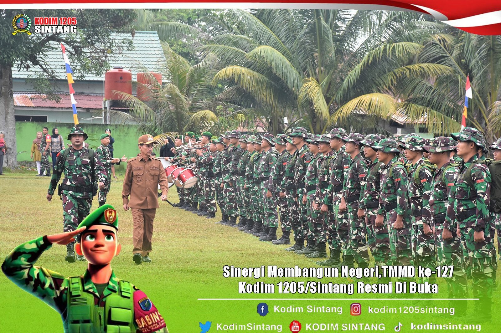 Sintang – Komando Distrik Militer (Kodim) 1205/Sintang secara resmi membuka kegiatan TNI Manunggal Membangun Desa (TMMD) ke-127 melalui upacara pembukaan yang berlangsung khidmat dan tertib. Kegiatan tersebut dirangkaikan dengan penyaluran bantuan sosial kepada masyarakat sebagai bentuk kepedulian TNI terhadap kesejahteraan warga.