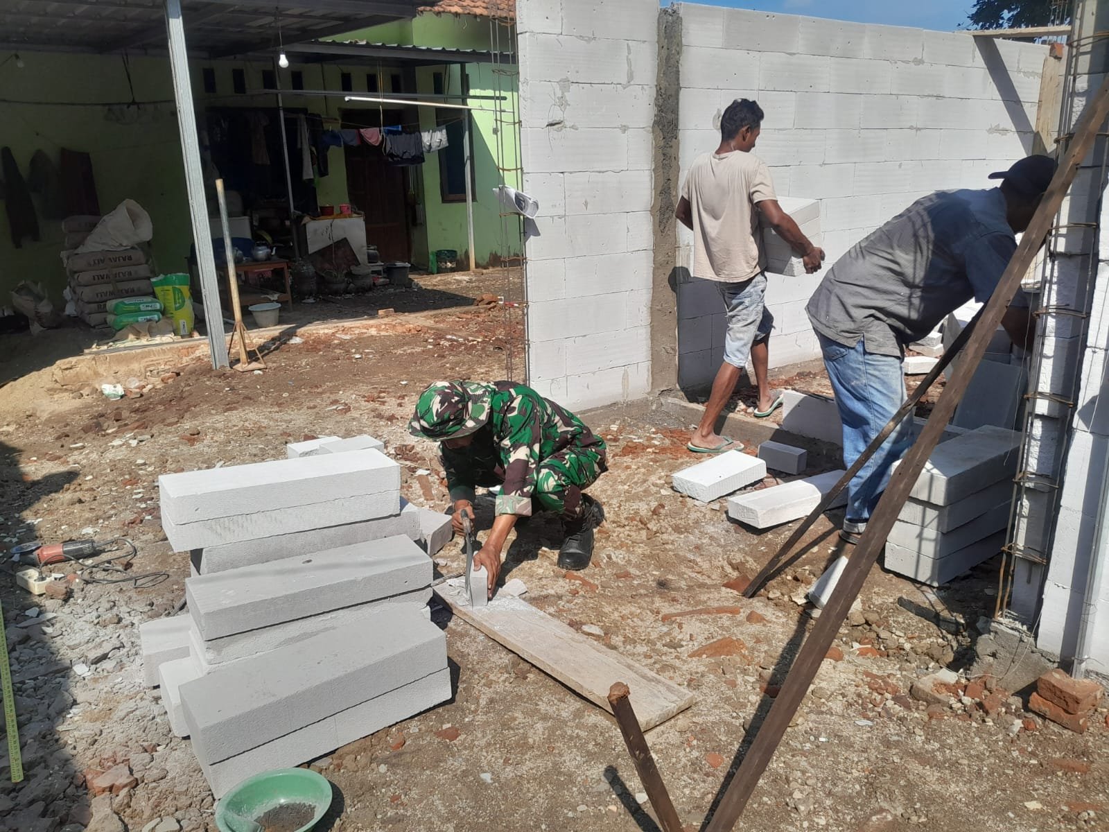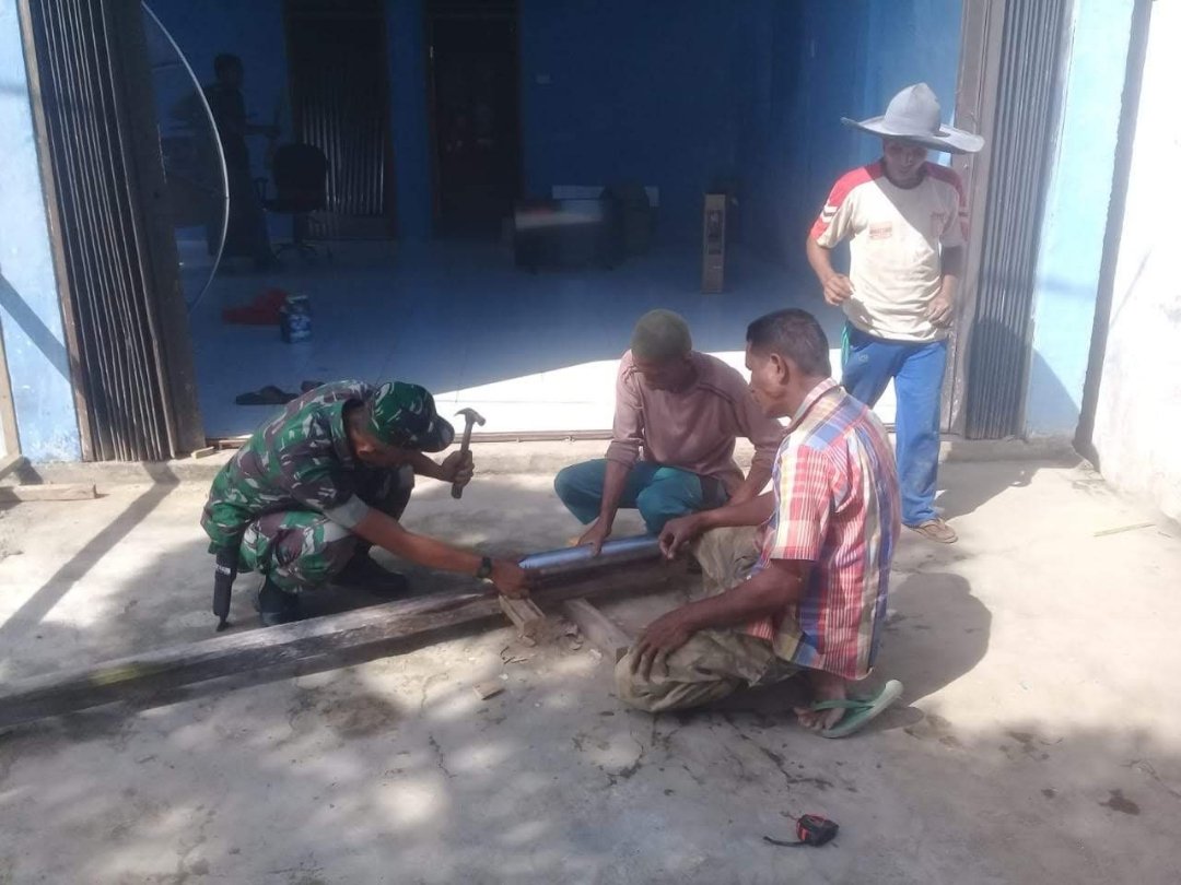 Perbaikan gudang meliputi pembersihan, perbaikan atap, serta penguatan permukaan jalan menggunakan bahan-bahan yang telah disiapkan bersama. Selain itu, kegiatan ini juga menjadi ajang mempererat hubungan antara TNI dan warga setempat.