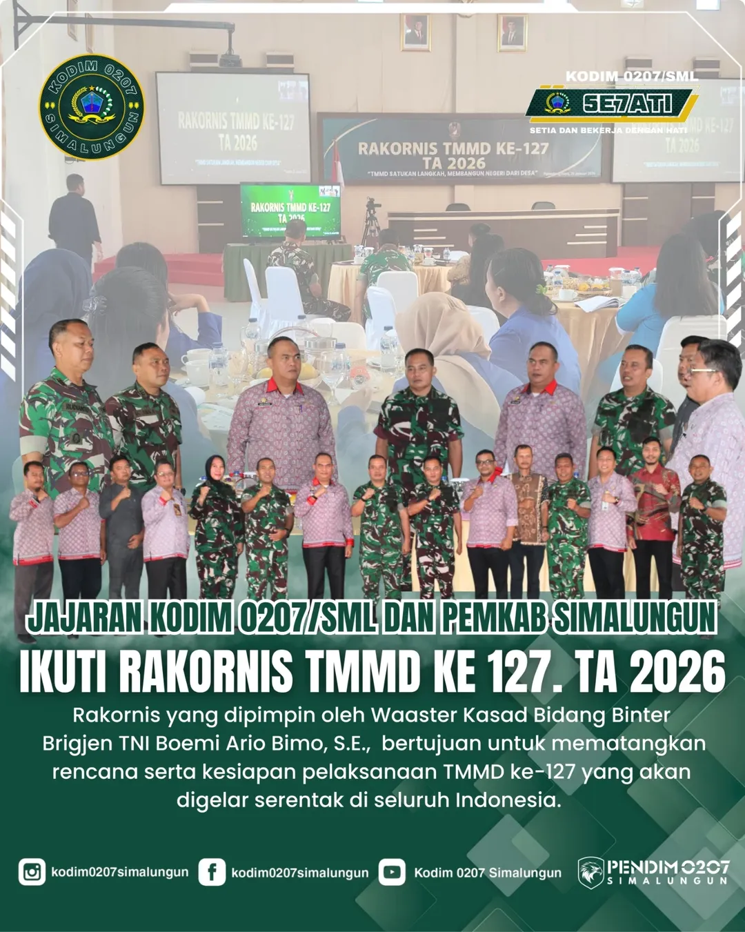 Sementara itu, Kasdim 0207/Simalungun Mayor Inf Prawoto menyampaikan bahwa pelaksanaan TMMD ke-127 Tahun Anggaran 2026 di wilayah Kodim 0207/Simalungun direncanakan berlangsung pada triwulan pertama tahun 2026, sekitar bulan Februari hingga Maret 2026. Program ini menjadi bagian dari komitmen TNI dalam mendukung percepatan pembangunan di wilayah pedesaan dan terpencil melalui sinergi bersama pemerintah daerah dan masyarakat.