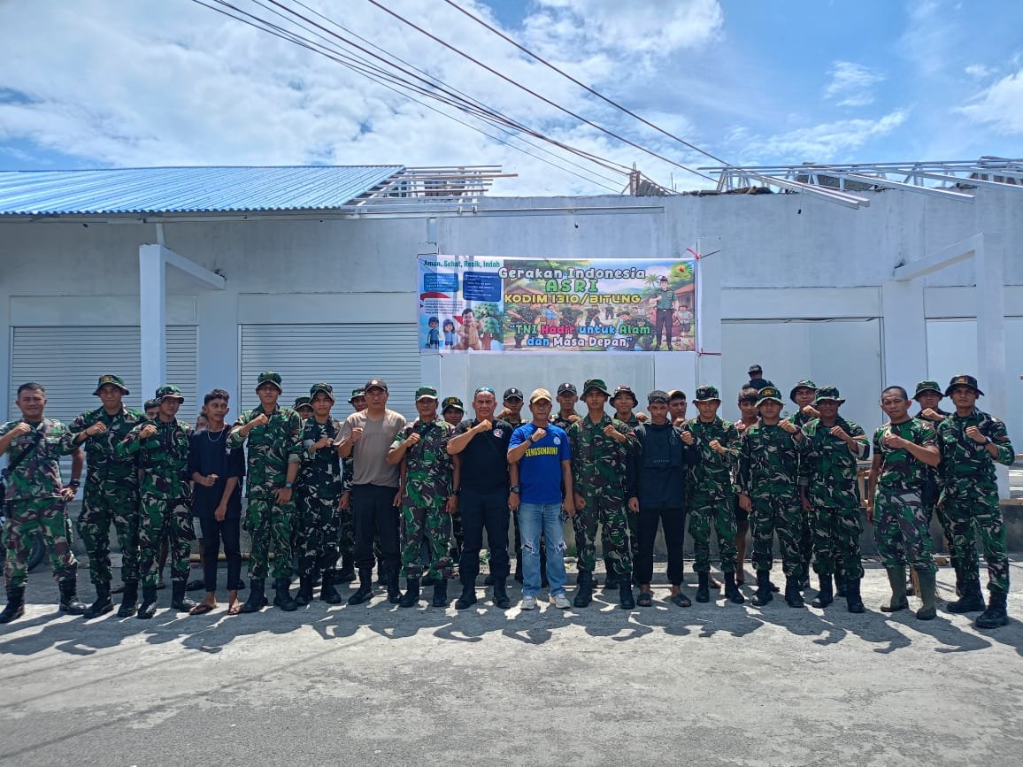 BITUNG – Dalam rangka mendukung Gerakan Indonesia Asri, Personel Kodim 1310/Bitung dan Yonif TP 916/Bara Sakti Kodam XIII/Merdeka bersama masyarakat, melaksanakan kegiatan Karya Bakti pembersihan lingkungan bertempat di Kompleks Kanopi, Kelurahan Bitung Timur, Kecamatan Maesa, Kota Bitung, Rabu (18/03/2026).