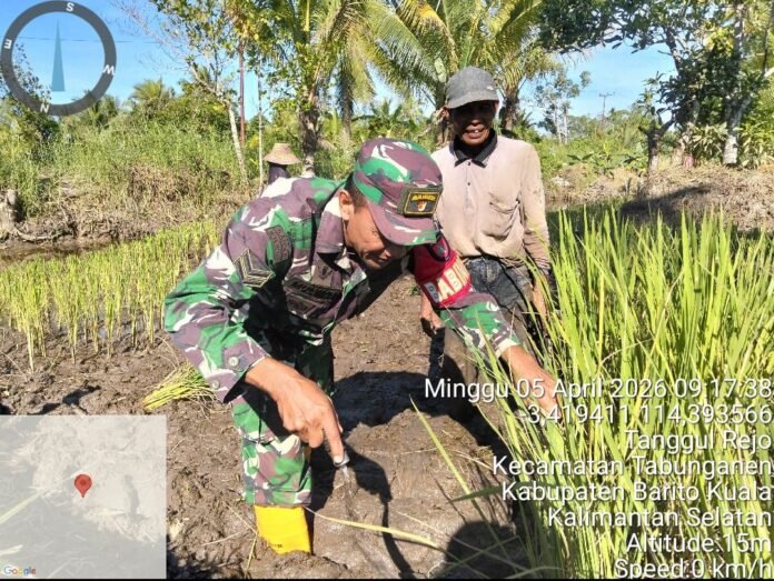 ‎BARITO KUALA – Dalam upaya mendukung ketahanan pangan nasional dan meningkatkan produksi pertanian, Babinsa Koramil 1005-11/Tabunganen, Sertu Mulyadi, melaksanakan kegiatan pendampingan Program Luas Tambah Tanam (LTT) di Desa Tanggul Rejo, Kecamatan Tabunganen, Kabupaten Barito Kuala, pada Minggu (5/4/2026).