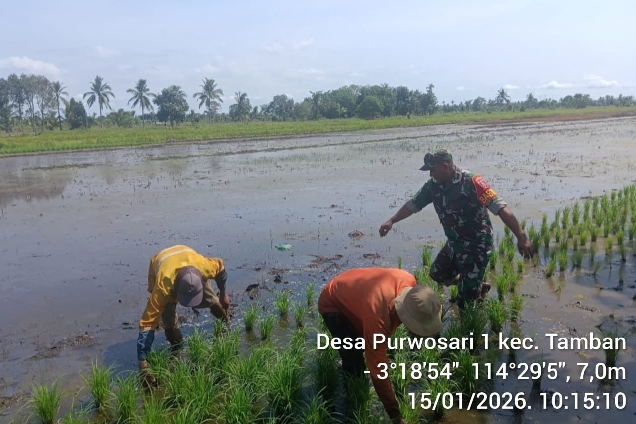Barito Kuala — Dalam upaya mendukung ketahanan pangan nasional dan memperkuat sinergi antara TNI dan masyarakat, Babinsa Koramil 1005-10/Tamban Serda Sumardi, melaksanakan kegiatan pendampingan Luas Tambah Tanam (LTT) dengan turun langsung ke sawah membantu petani menanam padi. Kegiatan ini berlangsung di Desa Purwosari, Kecamatan Tamban, Kabupaten Barito Kuala, Kalimantan Selatan. Pada Kamis 15 Januari 2026.
