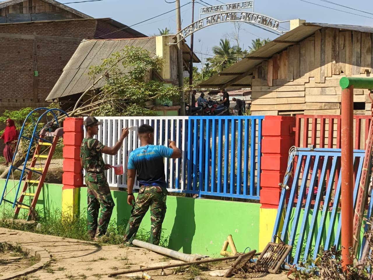 Selain area gedung, tim gabungan juga menyasar bagian luar dengan mengecat pagar sekolah secara menyeluruh. Melalui perpaduan warna cat yang rapi, fasilitas pengaman sekolah ini kini tampak lebih segar, sebagai bagian dari upaya TNI menciptakan ruang bermain yang edukatif dan ceria bagi para siswa pasca bencana.